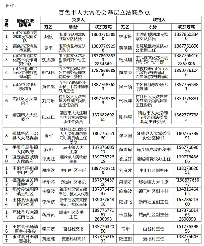 为贯彻落实《百色市立法条例》要求,进一步拓展公众有序参与百色市地方立法的途径,充分发挥基层群众在法治建设中的作用,不断提升人大立法的科学化和民主化水平,提高立法的针对性、可操作性和实效性,保证立法质量,经百色市第四届人大常委会第十二次主任会议决定,下列17家单位确定为市人大常委会立法基层联系点。任期与本届市人大常委会任期相同。